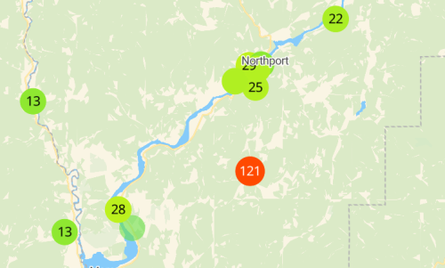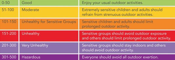 Here is the map showing the air quality from Purple Air air quality sensors. The sensors take air quality measurements that are converted to denote the level of health hazard using the scale below.