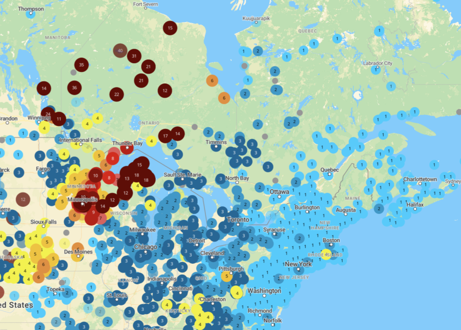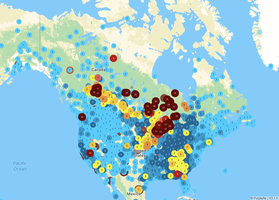 During May-June of 2025, a wildfire occurring in northern Manitoba and Saskatchewan produced smoke covering parts of Canada, USA, and even reaching the UK. Below are maps showing the AQHI of central Canada (left) and North America (right), showing the spread of the particulates over a vast range.